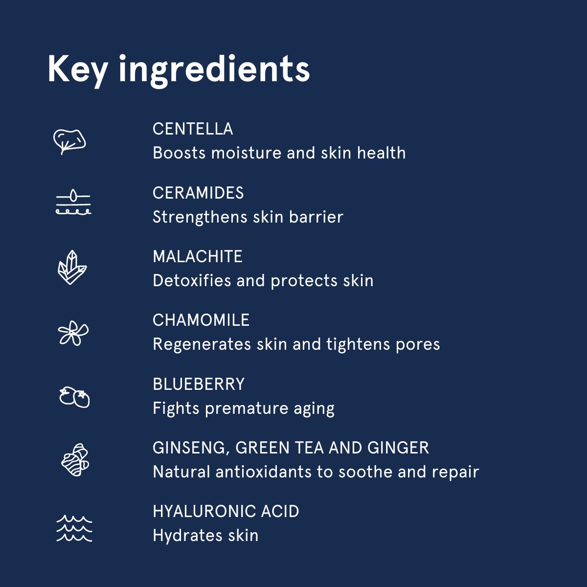 Enriched with Centella, Ceramides, Malachite, Chamomile, Blueberry, Ginseng, Green Tea, Ginger, and Hyaluronic Acid. - Formulated with Dermatologists for all skin types.