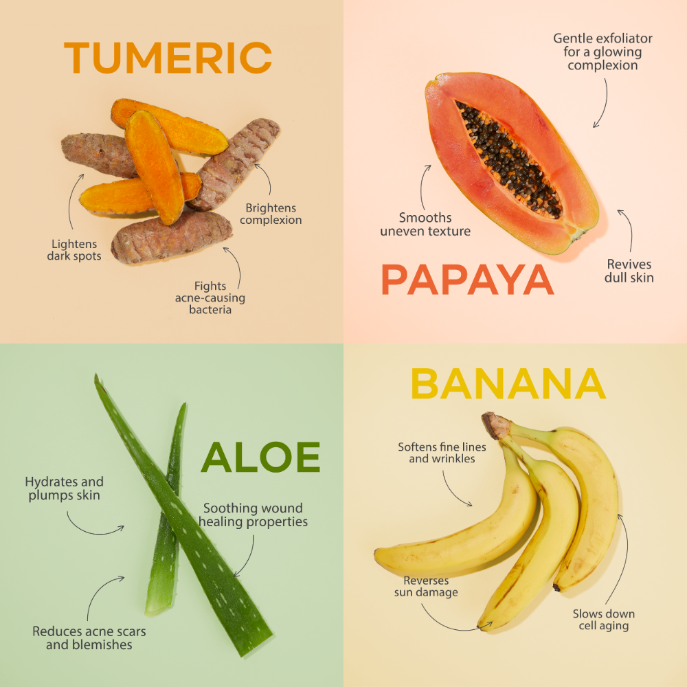 Ingredients: Musa spp (banana) powder fruit extract, Carica Papaya (papaya) powder fruit extract, Curcuma Longa (turmeric) powder, Aloe Barbadenesis organic (aloe vera) powder.