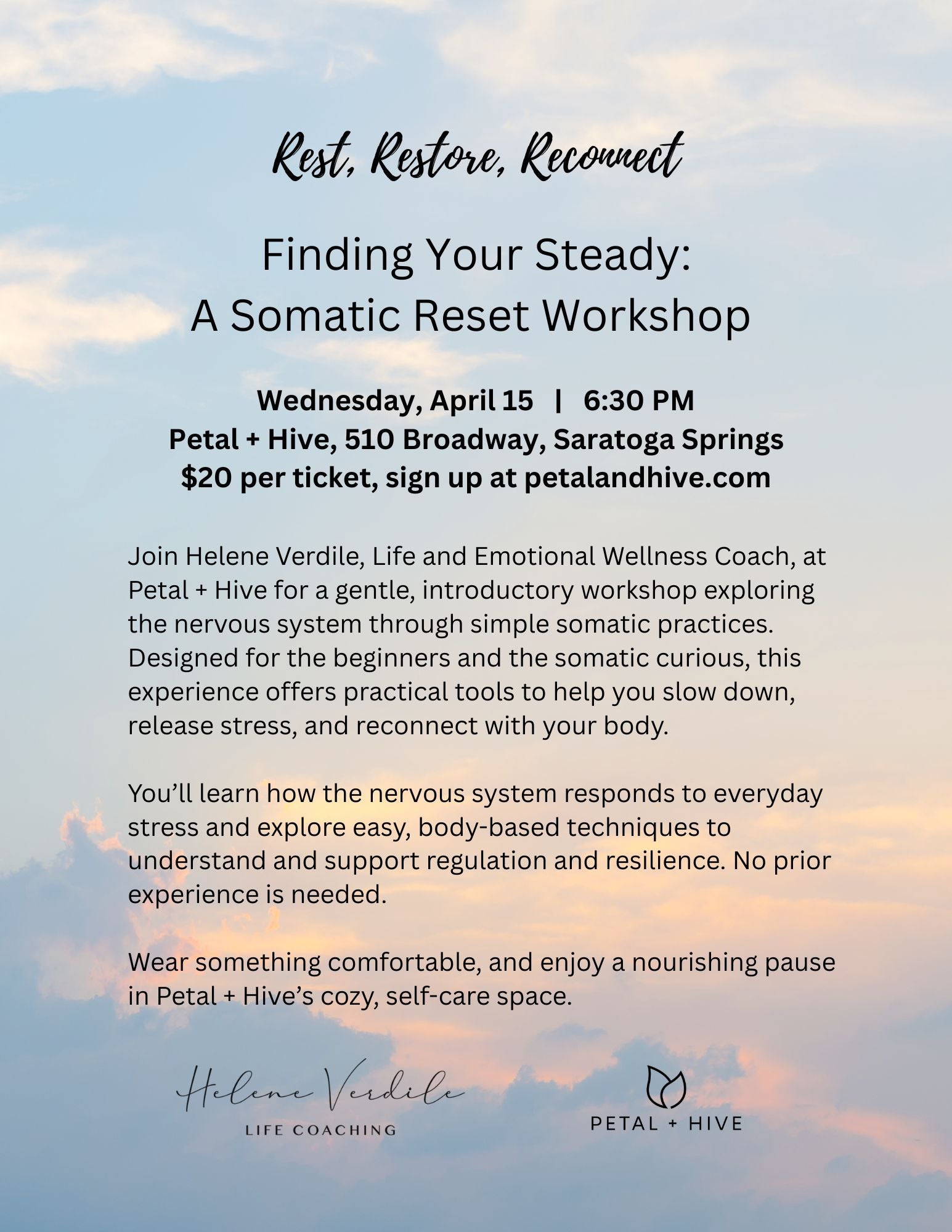 Join Helene Verdile, Life and Emotional Wellness Coach, at Petal + Hive for a gentle, introductory workshop exploring the nervous system through simple somatic practices. Designed for the beginners and the somatic curious, this experience offers practical tools to help you slow down, release stress, and reconnect with your body.